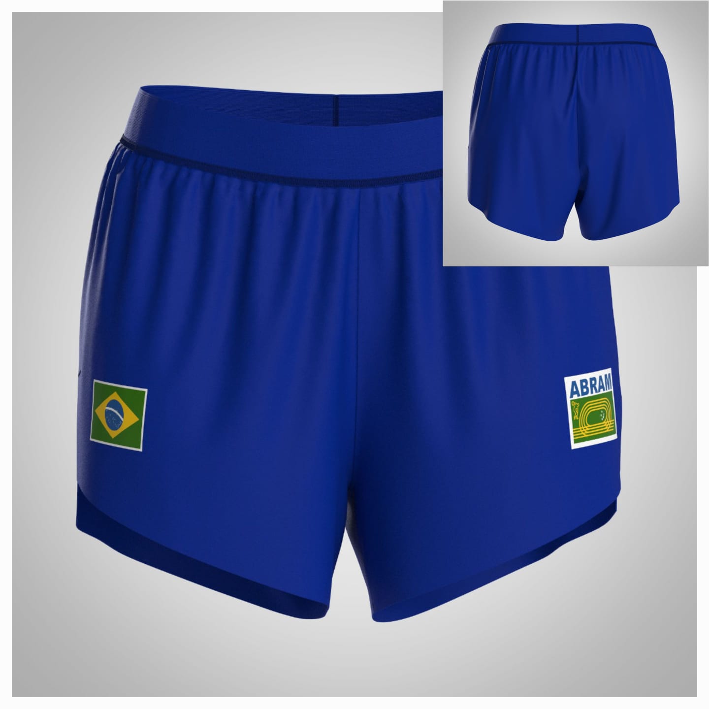 Shorts Masculino azul do uniforme dos atletas integrantes da Delegação Brasileira de Atletismo Master em competições internacionais, treinos entre outros.